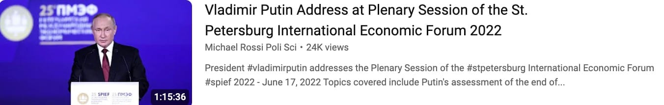 In not-unrelated vein, consider Vladimir Putin's Address at the Plenary Session of the St. Petersburg International Economic Forum 2022. You should resist your urge to delete or skip this - rather listen to what he said two years ago then compare that with what has happened versus what you were told by your own Politicians.