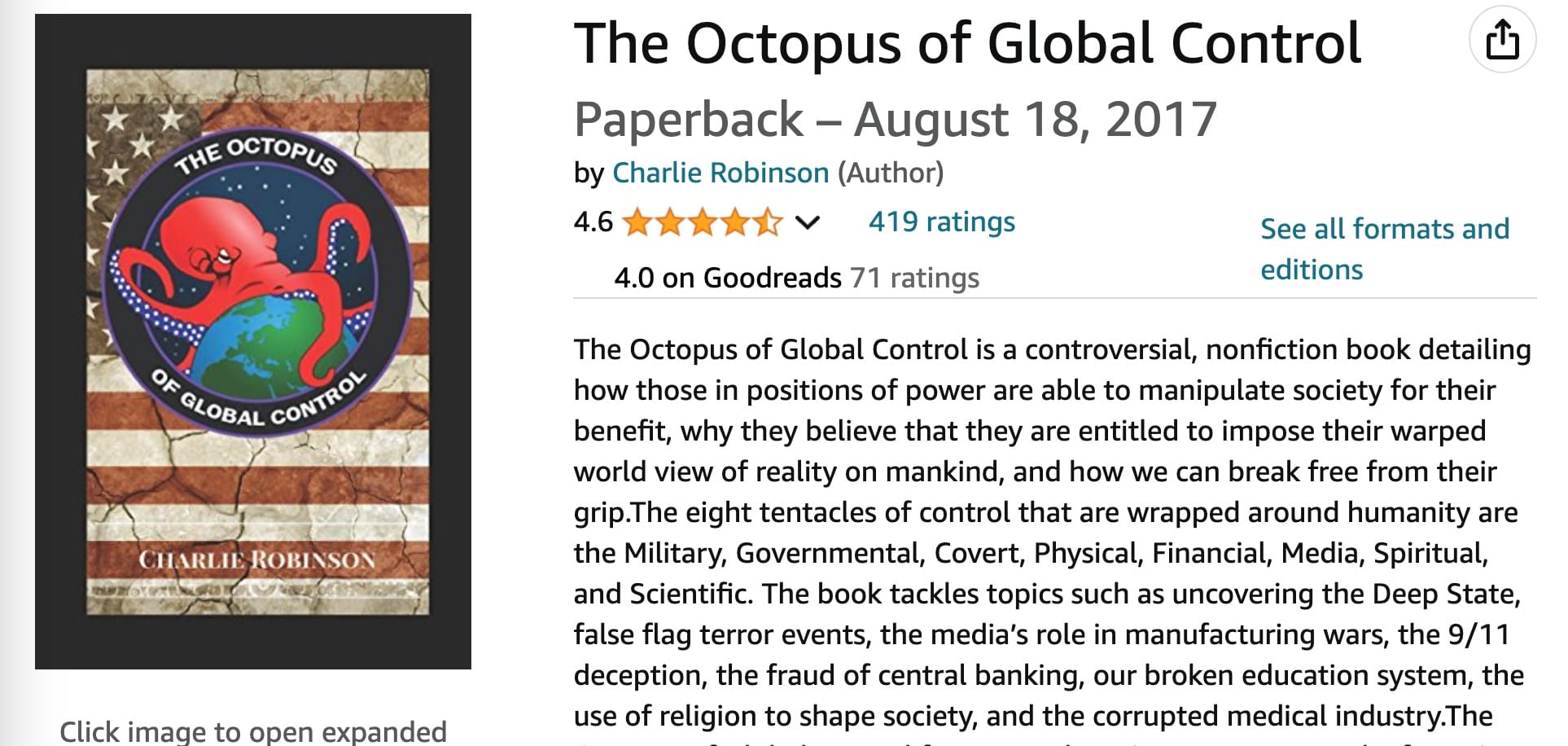 The eight tentacles of control that are wrapped around humanity are the Military, Government, Covert, Physical, Financial, Media, Spiritual, and Scientific. The book tackles topics such as uncovering the Deep State, false flag terror events, the media’s role in manufacturing wars, the 9/11 deception, the fraud of central banking, our broken education system, the use of religion to shape society, and the corrupted medical industry.