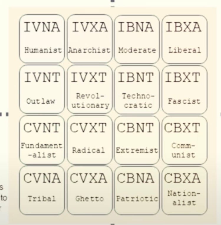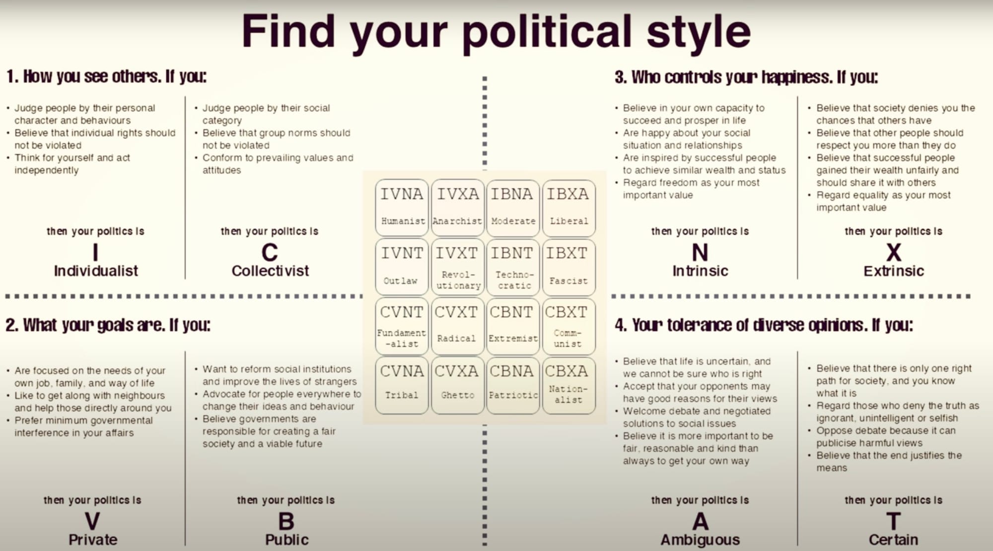 In his latest monologue he presents an alternative to the traditional right-left dichotomy based on four dimensions of political style. I really love this thinking and approach. As he explains it is inspired by the Multi-dimensional aspects of Meyers-Briggs