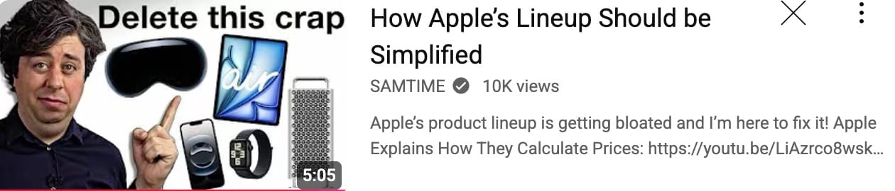 Sam has such a great sense of humour. Here he does an excellent job of describing Apple's current product line and how they really ought to clean it up.