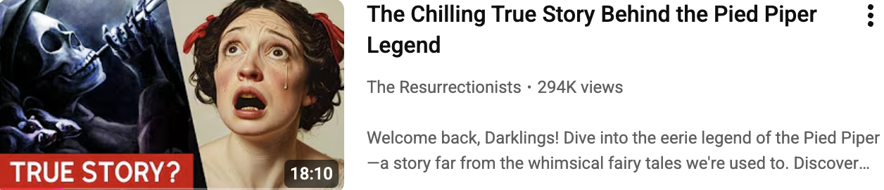 We all know fairy tales and they have been taught for centuries. What you might not know is that many of them (maybe all?) have factual, real-life origins. That of the Pied Piper is but one of many that this girl investigates and explains. I do recommend that you check her channel - you will be surprised by many.