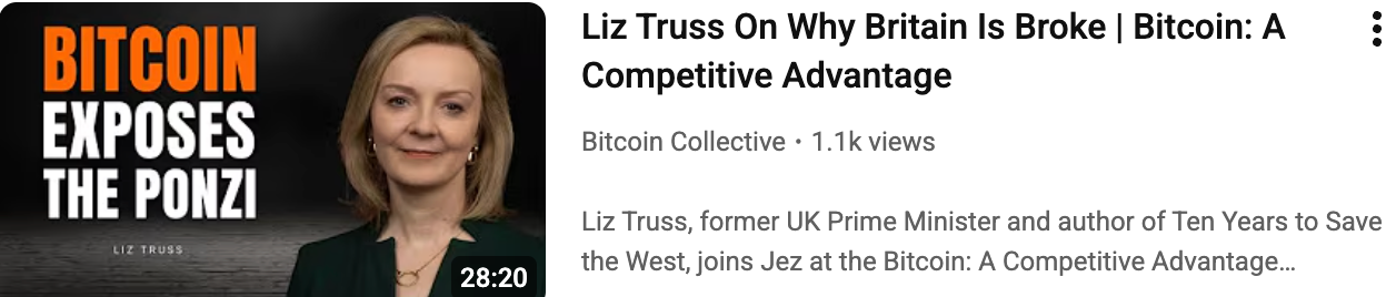 Next up is an interview from the recent Bitcoin conference in Derby - Liz Truss was the former (short-lived) UK Prime Minister. I am hesitant to trust any politicians but the tale of her downfall (as she recounts it) is certainly worth listening to. This ought to remind you of "Yes (Prime)Minister" - the truth hiding in plain sight. As a Bitcoiner this should all be obvious to you too!