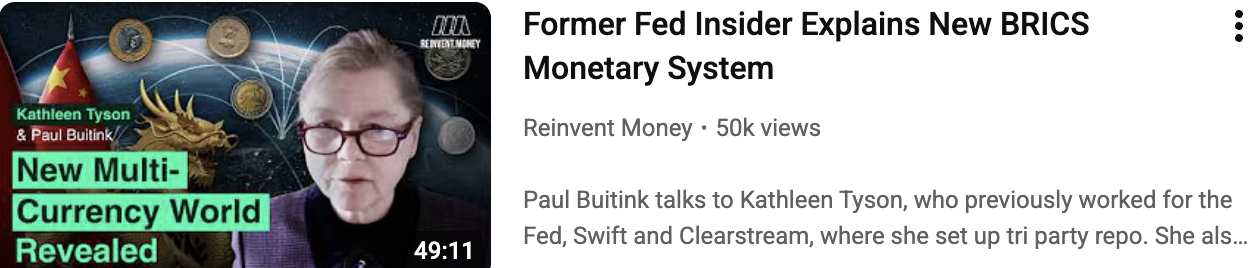 Paul is an interesting and thorough researcher based in the Netherlands. He recently did a most interesting interview with Kathleen Tyson who shares some rather interesting perspectives that you will certainly not hear in the mainstream. Kathleen, whose background includes work with the Federal Reserve, Clearstream, and SWIFT, provides a "plumber’s view" of the evolving global monetary system.
