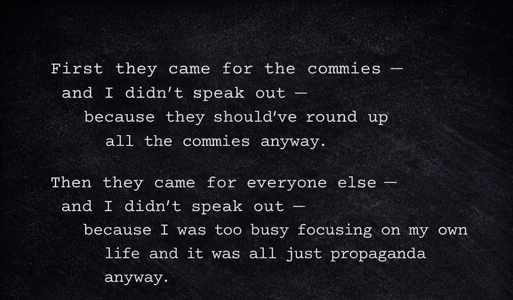 Then they came for everyone else - and I didn’t speak out - because I was too busy focusing on my own life and it was all just propaganda anyway.