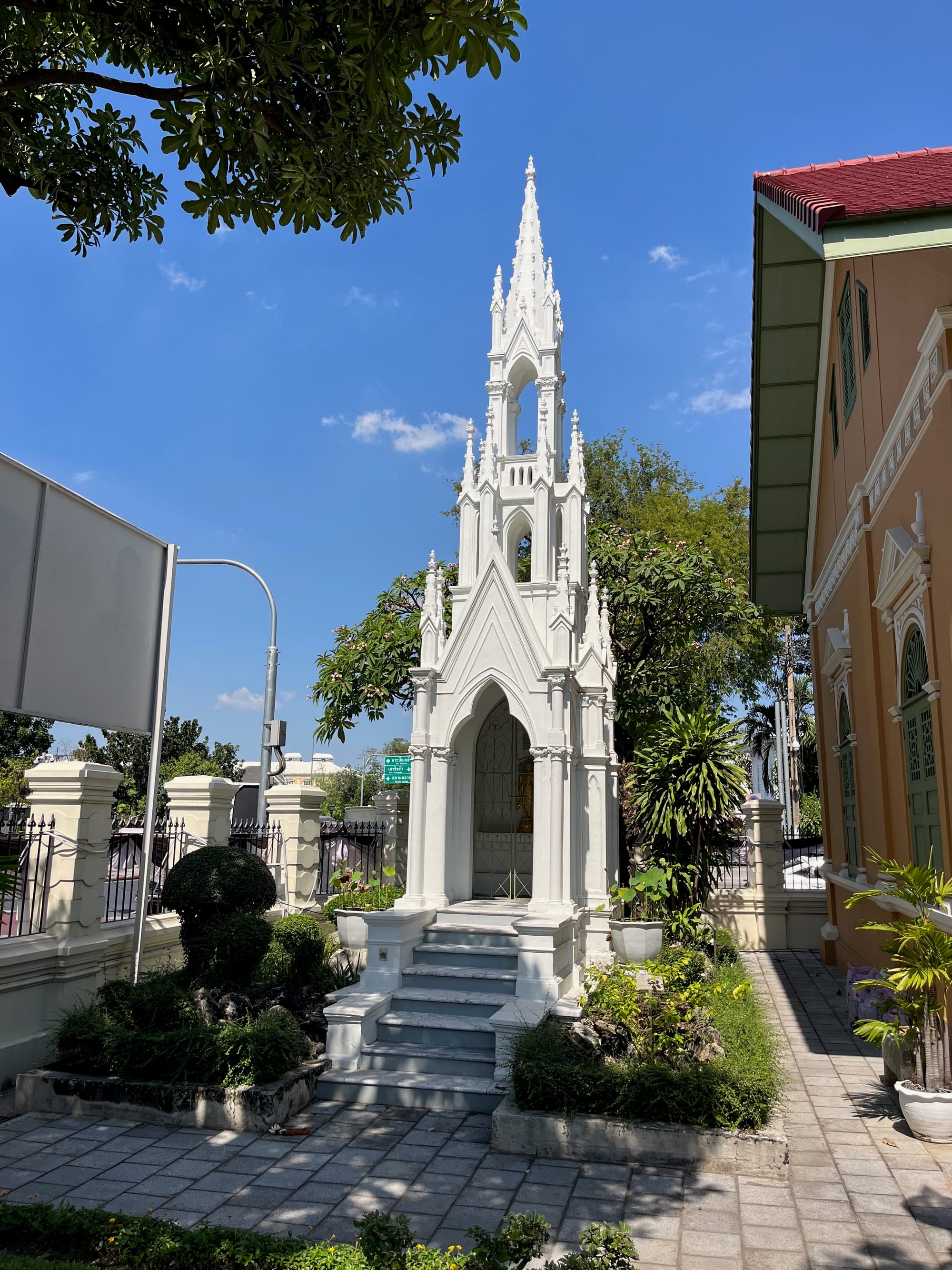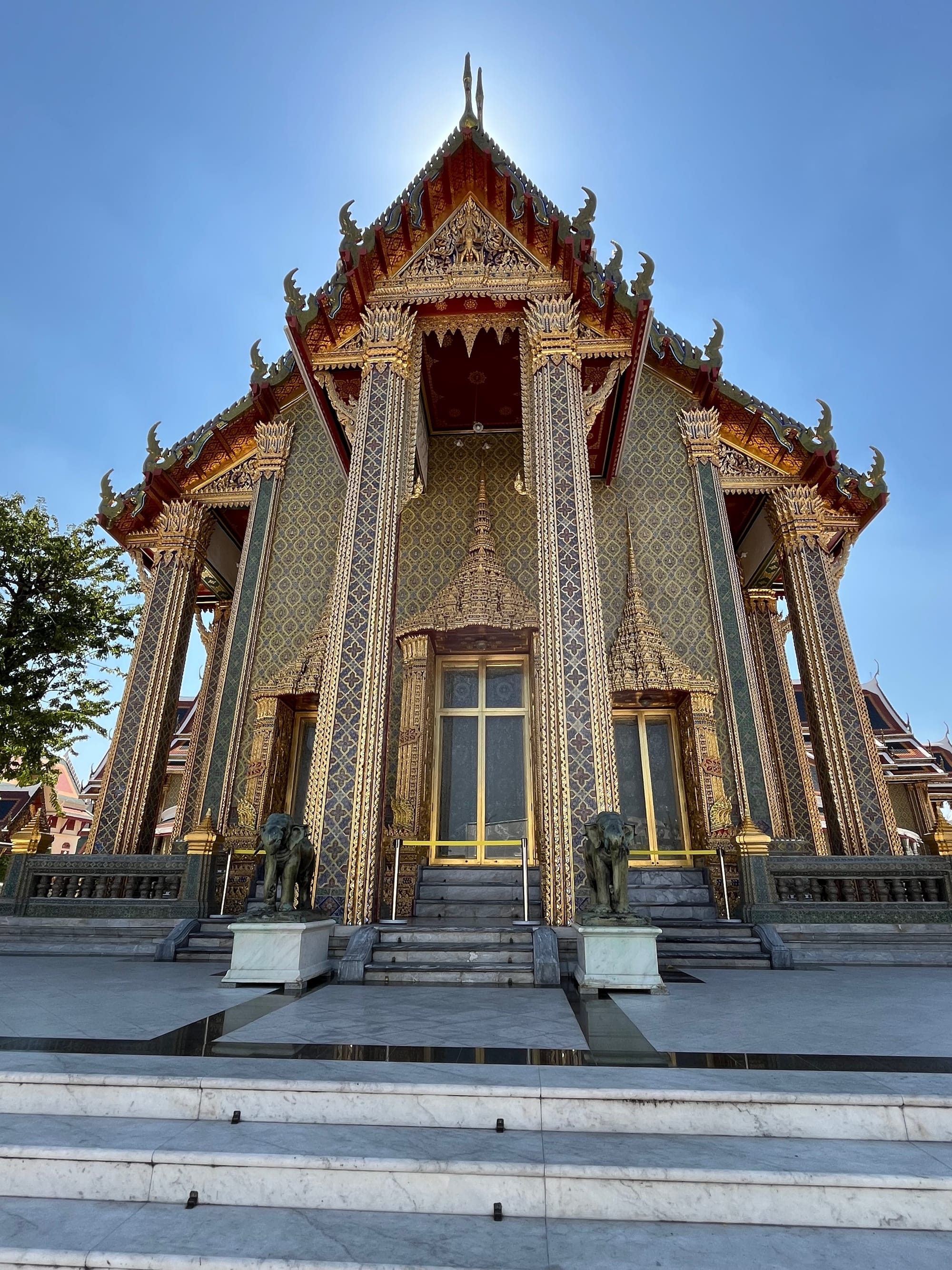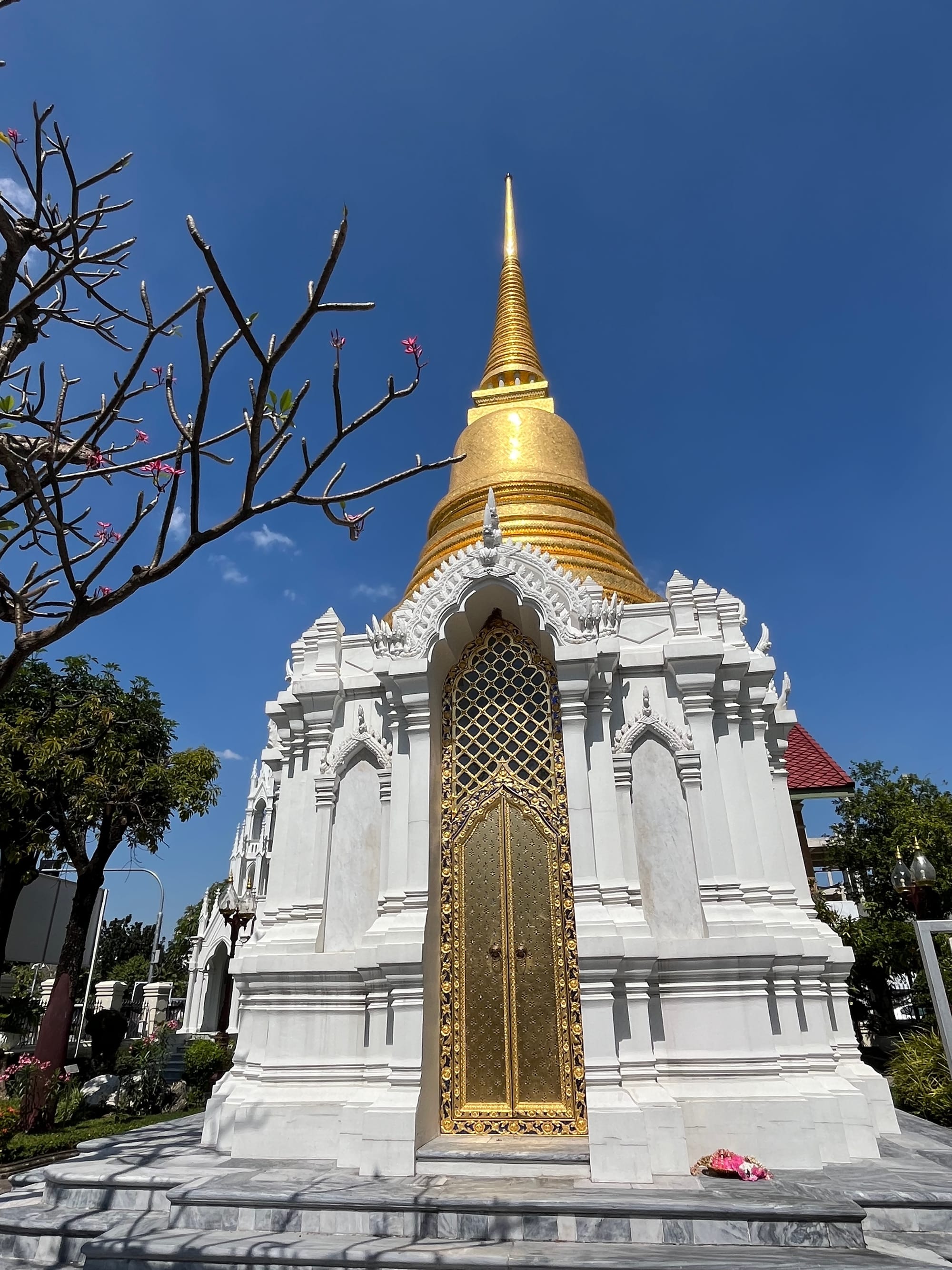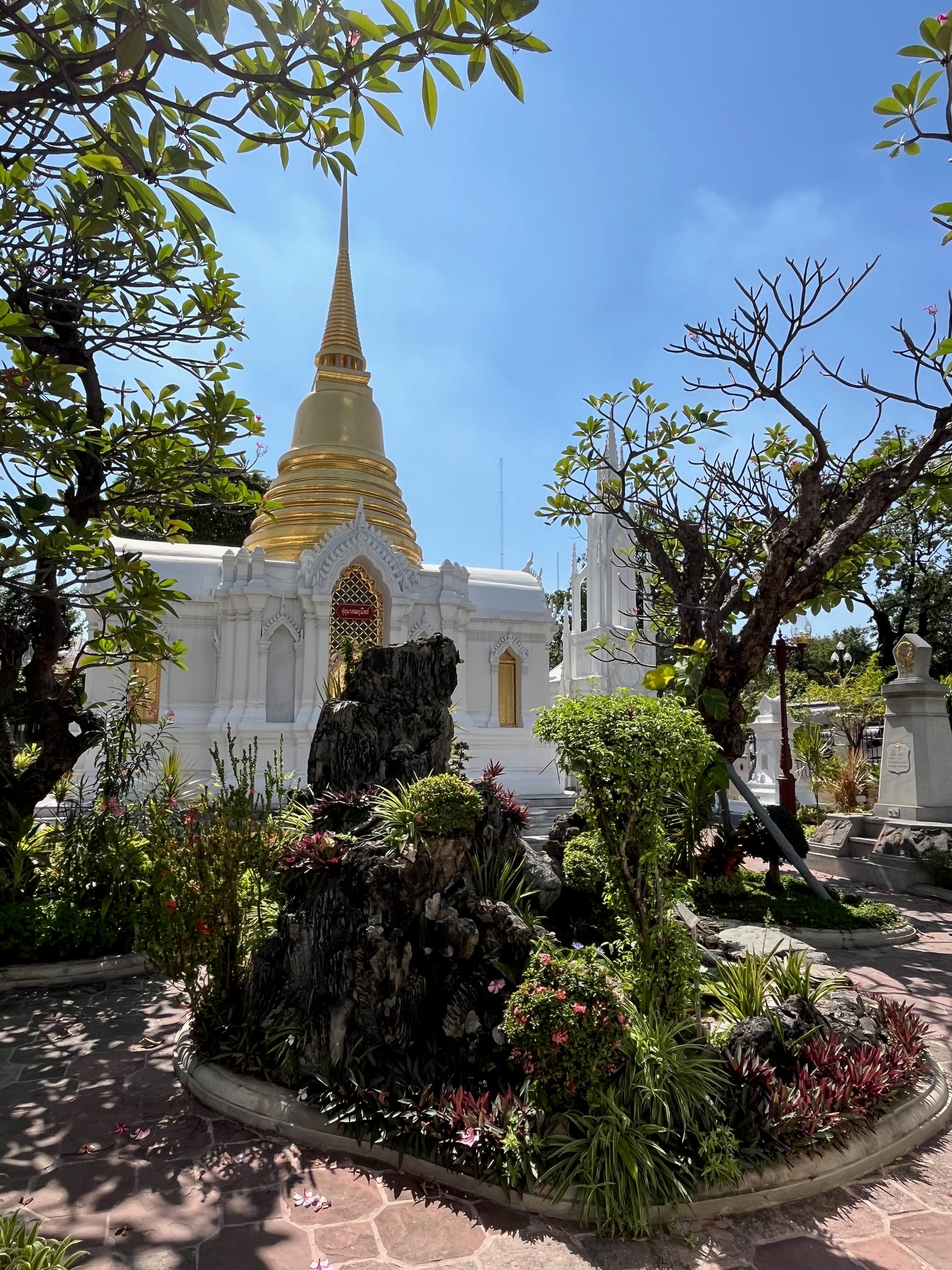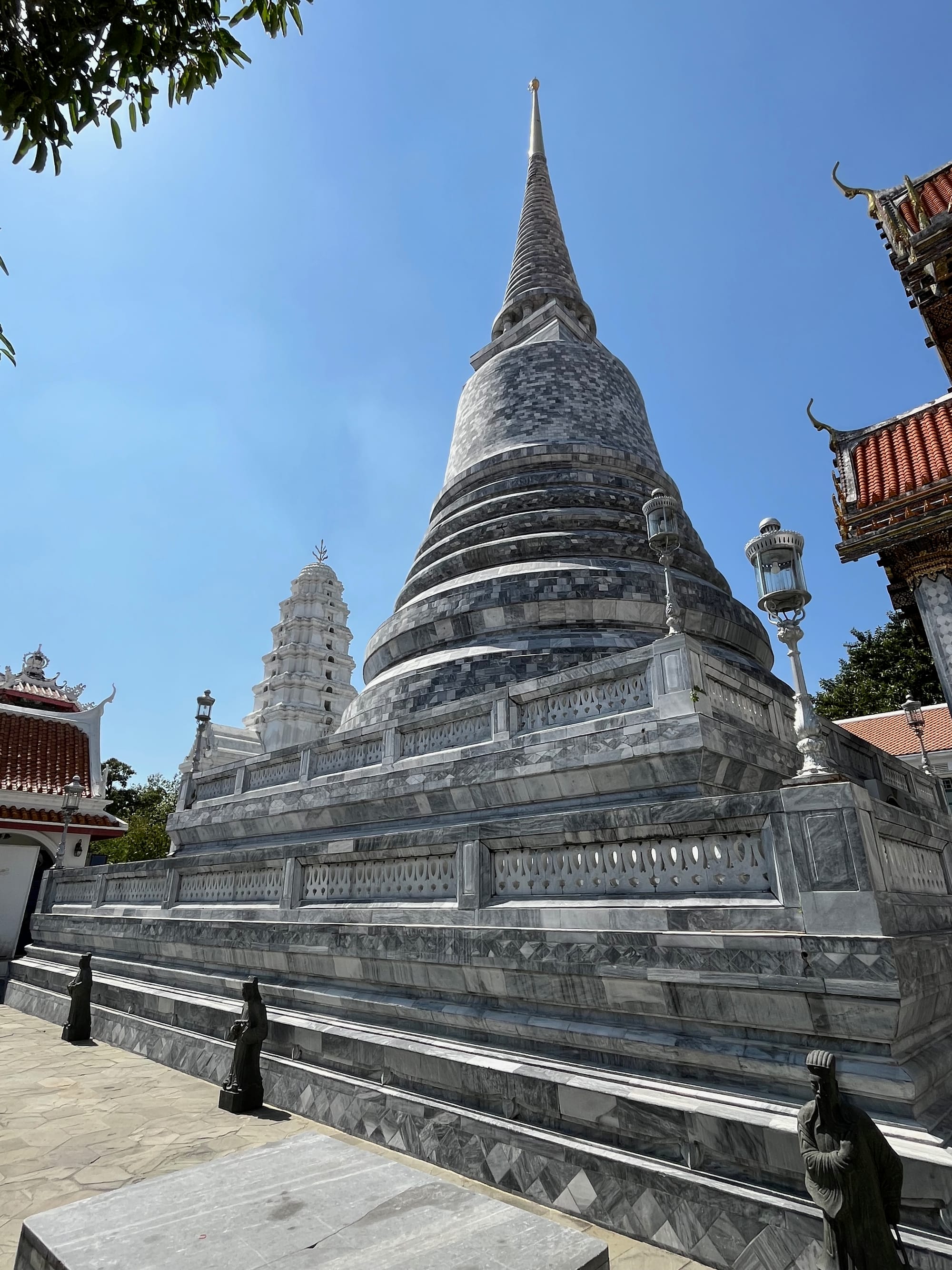 V and I have been taking advantage of a few cooler days to go walking around the old city here in Bangkok. Among other places we visited Wats Rajapradit and Rajabhopit this week. These are two rather beautiful temples, easily reachable beside the flower market and near the Royal Palace.