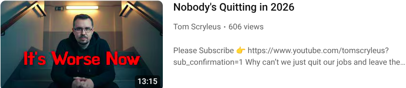 Thanks to Tom for pointing this out - and it is different this time. The Great Resignation promised freedom, but in 2026 most workers feel more stuck than ever. This video breaks down wage slavery, burnout, economic pressure and why escaping the 9-5 feels harder now than before. If work feels pointless, exhausting and inescapable — this explains why.