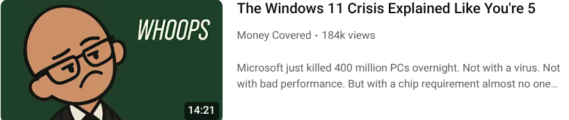 October 14th, 2025. Micro$oft just told 400 million people that their computers are now officially junk. Not because they're broken or slow but because they don't have a hardware chip that Micro$oft suddenly decided everyone needs. Your computer worked fine yesterday. Today, Micro$oft declares it obsolete and demands you to buy a new one to run Windoze.