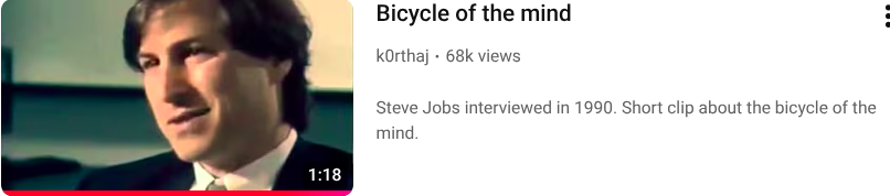 Steve Jobs first introduced the metaphor of computers as a "bicycle for the mind" in a 1980 presentation where he referenced a Scientific American article on animal locomotion efficiency. The concept originated from a study showing humans were relatively inefficient in movement until using bicycles, which dramatically increased their efficiency—mirroring how computers amplify human thought.