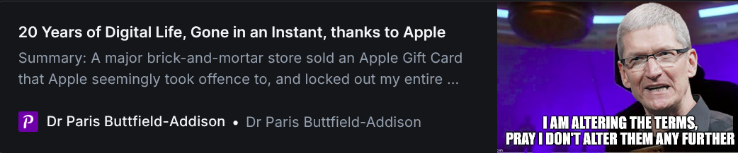 This is why you do want to get serious about having your data outside of Big Tech platforms and under your own control with your own backups. You should know by now that this means using Linux and Open Source software. It is never too late to start to do the right thing - what are you waiting for?