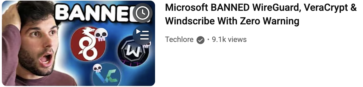 Listen as Henry from Techlore delivers a critical analysis of Micro$oft's sudden suspension of three major open-source security projects—WireGuard, VeraCrypt, and Windscribe - from the Windoze Hardware Developer Program.