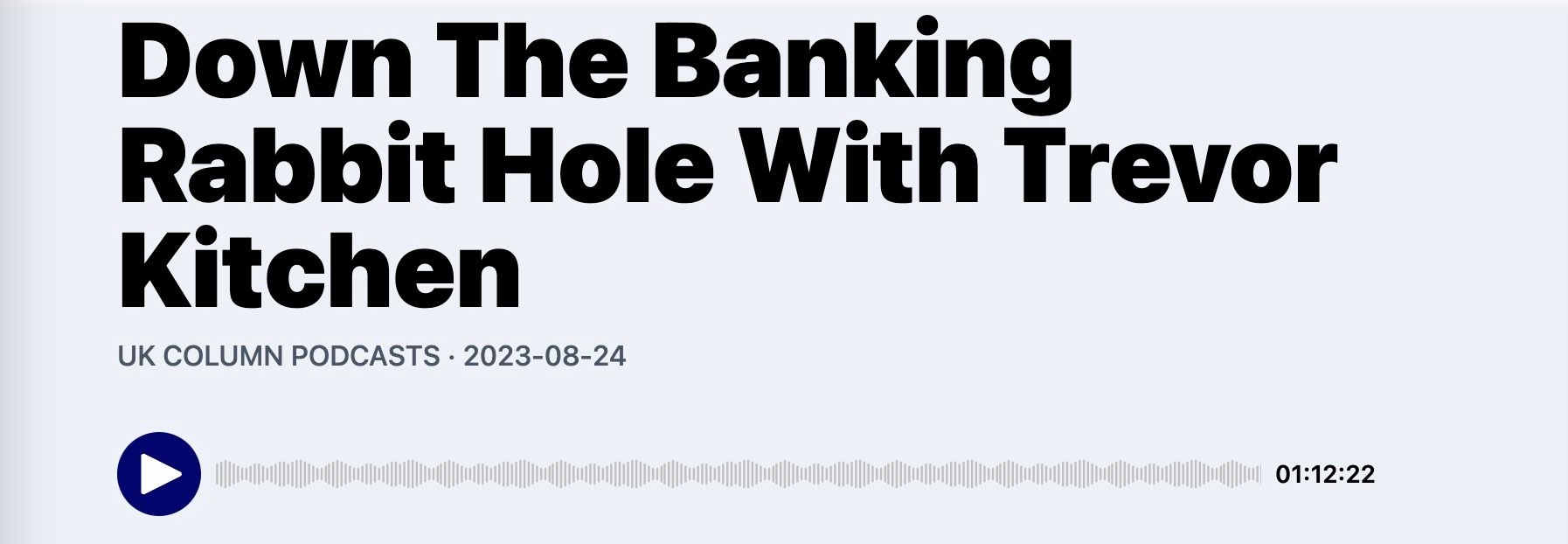 Second Interview: The UK Column is such a great source of well-researched and informative interviews. I have got to recommend this recent interview of Trevor Kitchen. You will learn, among other things, how the BIS in Switzerland has international immunity from all prosecution (just like the Vatican) - also how traditional banking is being eliminated with only investment banking remaining for the monied elite and how banking losses are always socialised whilst they capture all gains. Trevor has exposed many aspects of the financial fraud that has happened and is ongoing and like many other whistleblowers has been targeted by the elite interests.