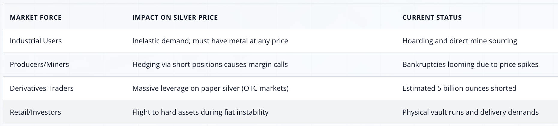 The primary driver of the current market volatility is a structural deficit in silver supply. Scott explains that industrial demand—driven by solar energy, high-end electronics, and battery production—is significantly outpacing mining output. Unlike previous speculative bubbles, this move is underpinned by "price-insensitive" buyers. Market manipulators who have been structurally "short silver" for decades are now caught on the wrong side of the trade.