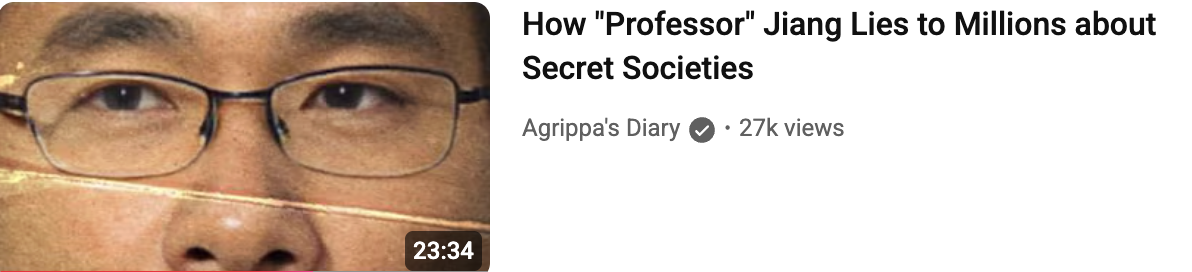 Agrippa (Alexander, creator of the Agrias Diary project) argues that Professor Jiang is running a misinformation campaign about secret societies, despite being occasionally correct on geopolitics. He acknowledges this critique comes at a cost—addressing Jiang at "the peak of his popularity is a death sentence for my channel"—but insists on providing esoteric clarity.