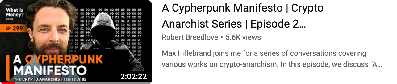 First up is reading and discussion of A Cypherpunk's Manifesto by Eric Hughes. Â You would do well to read the short document yourself or listen to this reading and discussion. Â Written 40 years ago you have got to admire the foresight at least; he got so much absolutely right.