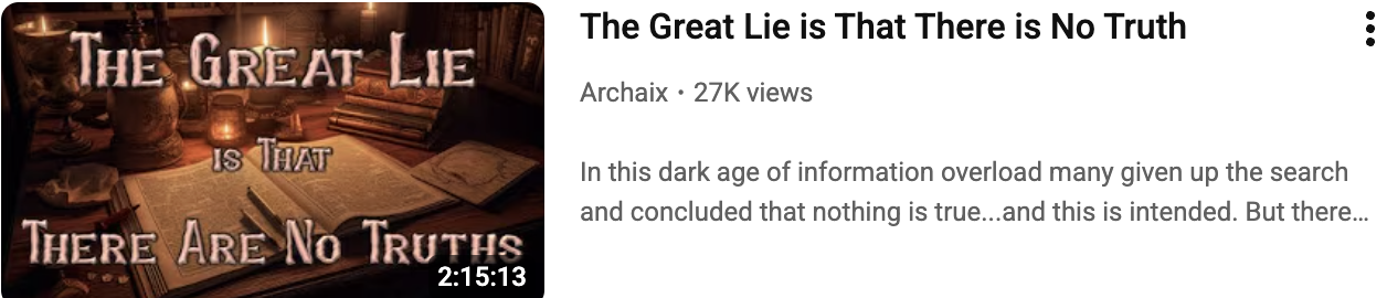 The title of this video is “The Great Lie”: the claim that there is no truth. This idea appears in Marxist literature and was part of an effort to overwhelm the public with so much information that people lose the ability to decide truth from falsehood. When confronted with too many options, people sometimes default to apathy or despair and reject everything. I sympathize with people who get overwhelmed, but I absolutely disagree with the blanket claim that nothing is true. Archaix research isolates what is true and what is false. If you invest years in collating information and know where to look, you can discern truth from falsehood.